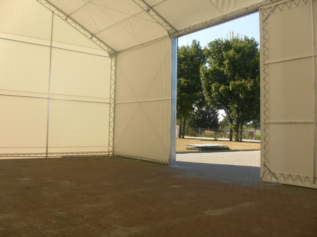 Standardowym wyposażeniem naszych hal namiotowych są bramy rolowane znajdujące się w obu szczytach.